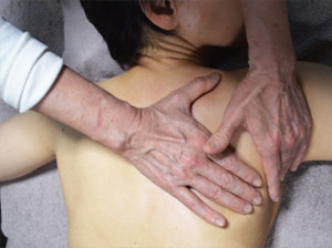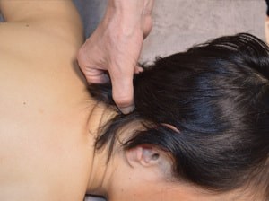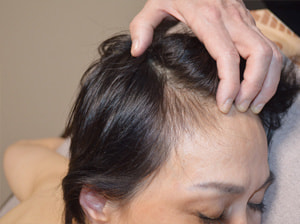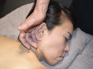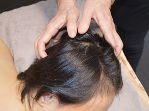目のまわり、こめかみ、そして側頭部からの首、背骨沿いを炭酸オイルで丹念に流していきます。