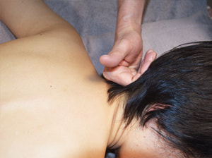 耳のまわり、側頭部全体、首から背骨沿いにかけて、炭酸オイルで丹念に流していきます。