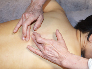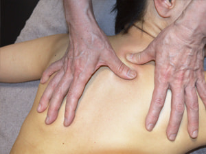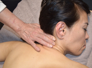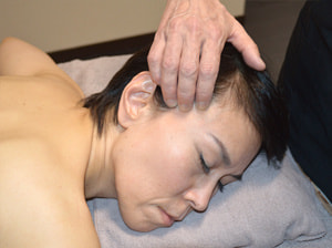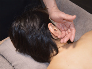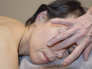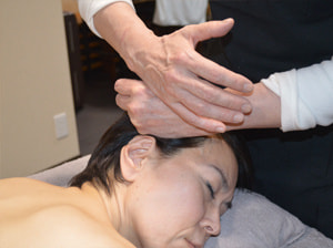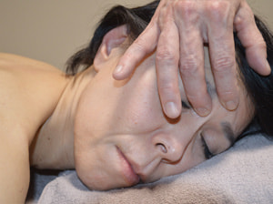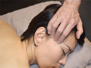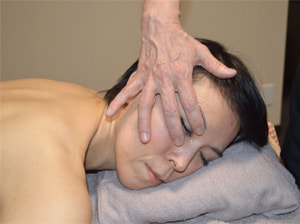 目のまわり、こめかみ、そして側頭部からの首、背骨沿いを炭酸オイルで丹念に流していきます。